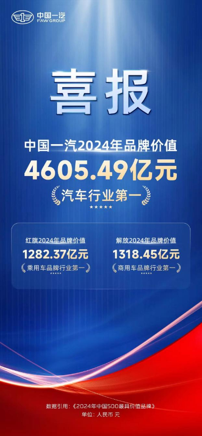 6月19日,第二十一届“世界品牌大会”在北京举行。会上,世界品牌实验室发布了2024年《中国500最具价值品牌》分析报告。这份基于财务数据、品牌强度和消费者行为分析的报告显示,中国一汽2024年品牌价值为4605.49亿元,蝉联汽车行业第一,连续21年上榜中国500最具价值品牌。报告显示,此次入选的500个品牌总价值为38.57万亿元,较去年增逾12%。