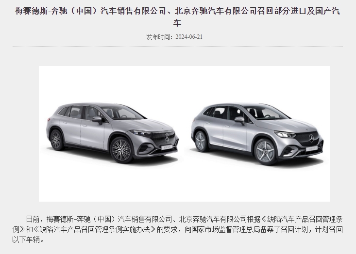 据国家市场监督管理总局缺陷产品召回技术中心消息,日前,梅赛德斯-奔驰(中国)汽车销售有限公司、北京奔驰汽车有限公司根据《缺陷汽车产品召回管理条例》和《缺陷汽车产品召回管理条例实施办法》的要求,向国家市场监督管理总局备案了召回计划,计划召回以下车辆。自2024年6月21日起,召回生产日期在2023年11月28日至2024年2月7日期间的部分进口EQS SUV汽车,共计39辆;生产日期在2023年11月1日至2024年4月25日期间的部分国产EQE SUV汽车,共计2341辆。