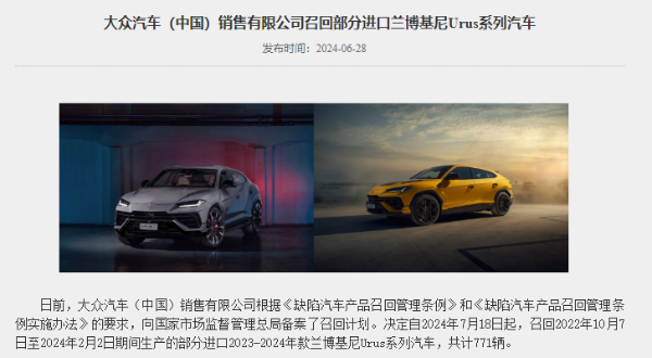 据国家市场监督管理总局缺陷产品召回技术中心消息,日前,大众汽车(中国)销售有限公司根据《缺陷汽车产品召回管理条例》和《缺陷汽车产品召回管理条例实施办法》的要求,向国家市场监督管理总局备案了召回计划。决定自2024年7月18日起,召回2022年10月7日至2024年2月2日期间生产的部分进口2023-2024年款兰博基尼Urus系列汽车,共计771辆。