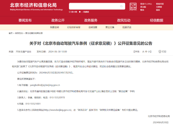 据北京市经济和信息化局网站6月30日消息,为推动自动驾驶汽车产业高质量发展,助力打造全球数字经济标杆城市,落实北京市委市政府关于加快自动驾驶汽车立法的指示精神,该局会同相关部门起草了《北京市自动驾驶汽车条例(征求意见稿)》(以下简称《征求意见稿》)并面向社会各界公开征求意见。《征求意见稿》中提出,支持自动驾驶汽车用于城市公共电汽车客运、出租汽车客运(网约车)、汽车租赁等城市出行服务。