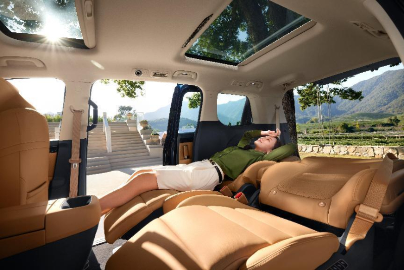 E8荣耀系列二排座椅可以4向移动,形成大四座模式,前后排座椅的间隔达到885mm,足以让孩子在里面轻松跑动;三排座椅往后翻折90°,形成观景茶座模式,可以钓鱼、可以喝茶,惬意感十足;三排座椅还能完全收纳到车厢地板下,形成一个超大的后备箱空间,直接变身儿童乐园。