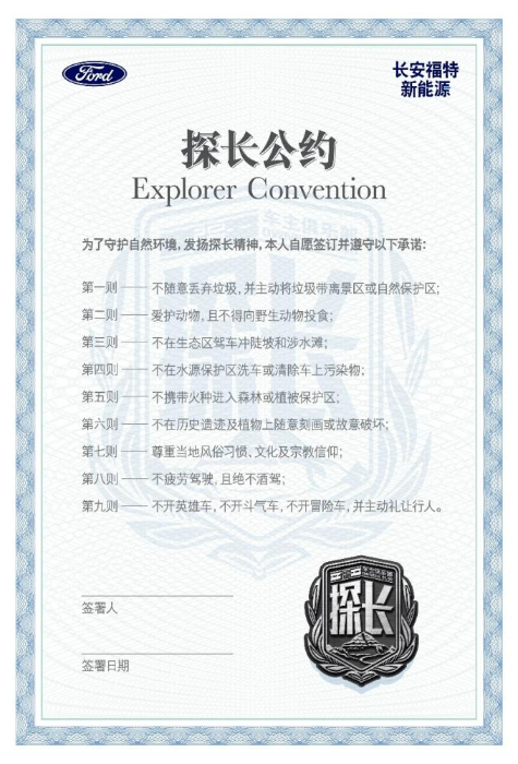 以相似的选车和用车习惯为纽带,能够更容易发现一个存在共鸣和交集的人群。福特探险者历经六代车型,全球有近900万用户,集合福特百年造车经验和精湛工艺,以“大道致简”为产品底色,兼具硬核与豪华,成为更多用户的座驾之选。作为探险者车主,他们乐于探索未知,勇于挑战,同时非常具有社会责任感,愿意为社会尽一份责任和担当。基于这样的洞察,2021年长安福特新能源为福特探险者车主打造了专属用户圈层和共创体验平台“福探长俱乐部——探长行动”,呼吁大家签署《福探长公约》,成为一名“福探长”。“福探长行动”致力于给用户创造独特且有意义的体验,带他们走别人不敢走的路,去看别人看不到的风景,做前人没做过的事,一起去有担当地“野”。