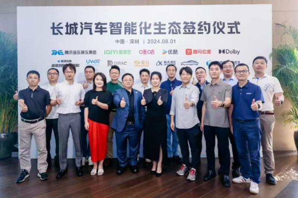 2024年8月1日,长城汽车在深圳举行智能化生态合作伙伴签约仪式,现场与腾讯、高德、科大讯飞、杜比、Dirac、优酷、爱奇艺等海内外头部企业达成战略合作。此次签约不仅拓展了长城汽车智能化生态“朋友圈”,也标志着长城汽车智能化步伐再次提速,为即将上市的魏牌全新蓝山带来强大的技术支持。