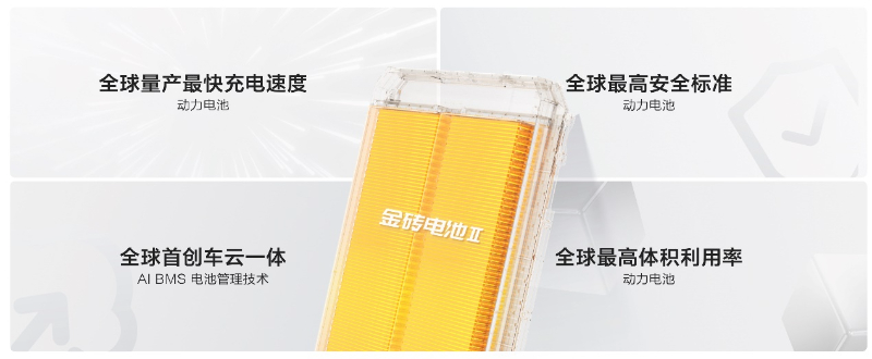 同时,第二代金砖电池更有全球最高电池安全标准,采用8大热安全防护技术,通过电芯超压针刺实验、240秒火烧实验,以及整包六大极端工况串行测试;另外还采用了全球首创的车云一体AI BMS电池管理技术,通过云端大模型和电池预警模型,提升电池电量估算精度,提前识别风险车辆,提升电池全生命周期的健康监测精度,还可以合理引导用户习惯,延长电池使用寿命。