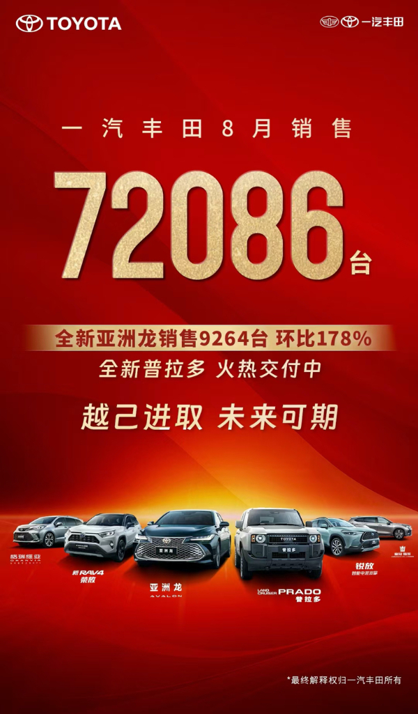 在激烈的市场竞争中,一汽丰田也始终稳步向前。进入下半年,一汽丰田月均销量7万余台,刚刚过去的8月销售了72086台,其中,传统燃油车型份额7.0%,比6月份上涨1.1%。1-8月累计销售46.3万台,以全新亚洲龙、全新普拉多为代表的TNGA-K高端化车型销量23.5万辆,占比50.8%,同比增长3.9%,展示出一汽丰田高端化转型成果加速落地,品牌多元化向上发展迈入新台阶。而优异成绩的取得,离不开一汽丰田避免过度“内卷”,坚持长期主义发展的方略。