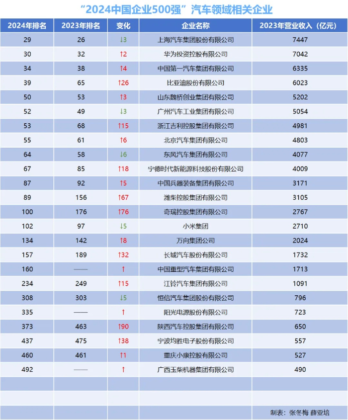 具体到汽车及相关领域,根据中国汽车报统计,共有24家相关企业上榜。