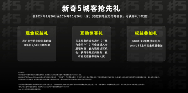 同时,全新smart精灵#5还为“新奇5乘客”准备了三大抢先权益。自9月20日至10月26日(含),完成意向金支付的密友,可享“现金权益礼”,用户支付的500元意向金,可抵2500元现金购车款;“互动惊喜礼”欢迎已支付意向金的用户进入专属福利群,可优先获得试驾机会、专属顾问服务,更有抽奖惊喜等福利大奖;此外,“权益叠加礼”支持预售权益与上市定金权益叠加,豪华奇旅大五座SUV触手可及。