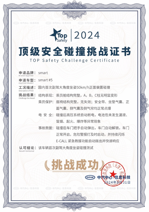 经过包括50公里正面偏置碰撞,行业内号称“魔鬼碰撞”的25%重合度小偏置碰撞等在内的130多项碰撞与安全的测试,全新smart精灵#5的整车稳定性卓越,符合全球测试标准,各种环境下都展现出优秀的安全性能。