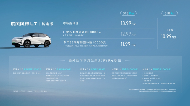 东风风神L7 EV 518 Pro官方指导价为13.99万元,综合补贴后售价11.99万元起;东风风神L7 EV 518 Air惊爆一口价10.99万元。与此同时,新车还带来了丰厚的福利:2024年10月31日24点前下定2000元并锁单的用户,还可额外享受至高价值35999元的五重礼。