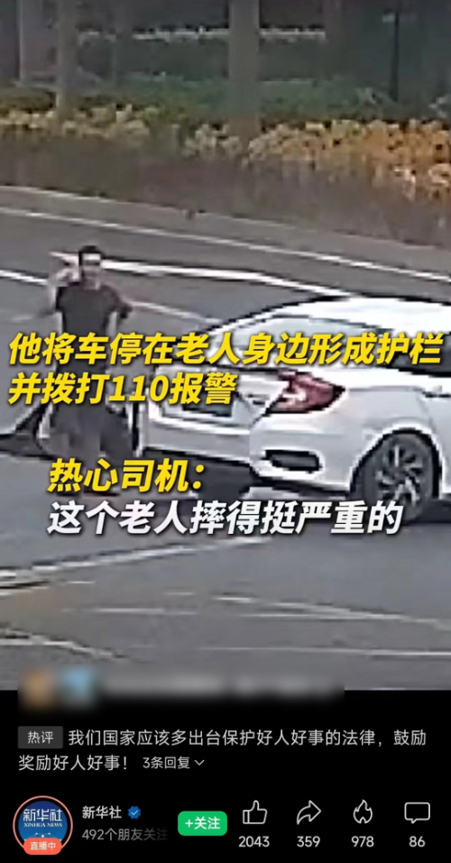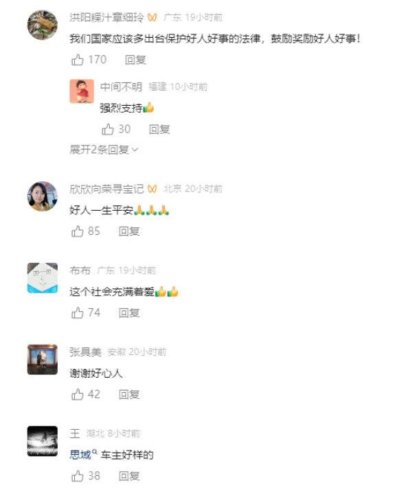 这一暖心举动恰好被监控记录了下来,相关视频经由阳江公安公众号、新华社视频号发布上网后,引来大量网友关注和点赞。网友纷纷在视频下留言,“这个社会充满着爱”“谢谢好心人”“思域车主好样的” “为好心人的做法点赞” “思域车主正能量”“愿善良的人一切安好!”