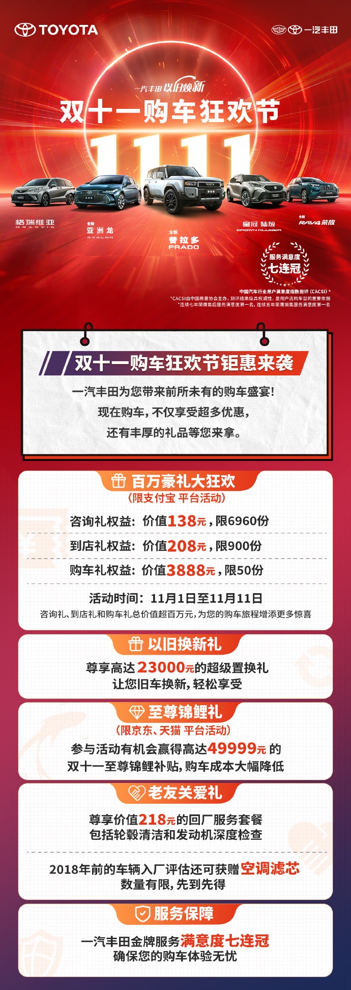 进入11月,车企冲刺年度销量目标的剩余时间仅剩两个月,各种“限时钜惠”“年末嗨购”等购车优惠政策密集发布。而论“宠粉”力度,一汽丰田榜上有名。11月,一汽丰田推出了“以旧焕新双十一购车狂欢节”,参与促销活动的用户,可享至高2.3万元置换补贴,成交用户可有机会获得至高49999元双十一补贴。另外,格瑞维亚还有专属的50%首付2年0利率,0首付起2-5年金融低息贷款,至高可享8000元厂家置换补贴等多重金融政策、置换补贴,以及丰厚的回厂、入厂、留资礼品,空前政策力度为用户创造最佳购车时机。
