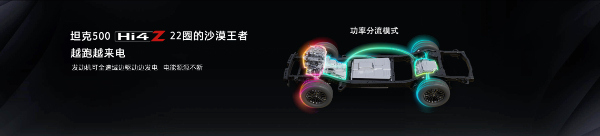 动力方面,坦克500 Hi4-Z搭载2.0T发动机和前后大功率驱动电机,三擎联动,可实现百公里加速4.6秒;纯电续航里程WLTC 201公里,完美做到“一周只充一次电,一次就能开一周”,综合续航近1100公里;得益于功率分流3挡的前驱模块,发动机可以做到全速域的高效直驱。