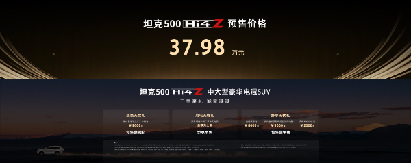 坦克500 Hi4-Z定位中大型豪华电混SUV,卓越的性能和豪华配置成为越野新能源市场的新标杆,拥有“全新智能、全面安全、全系豪华”三大配置亮点。