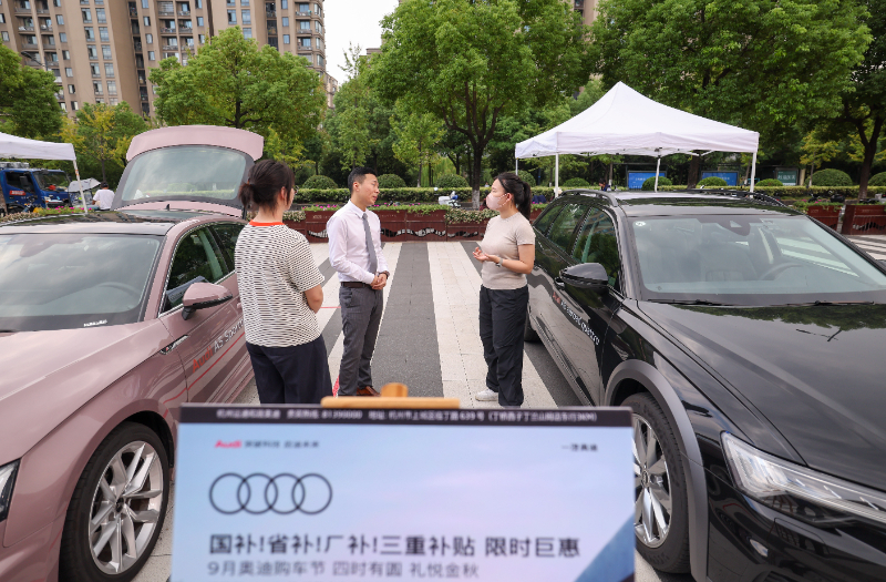 (资料照片)经销商在消费品以旧换新展会现场向消费者介绍车辆以旧换新政策补贴与品牌优惠的具体情况。新华社记者 江汉 摄