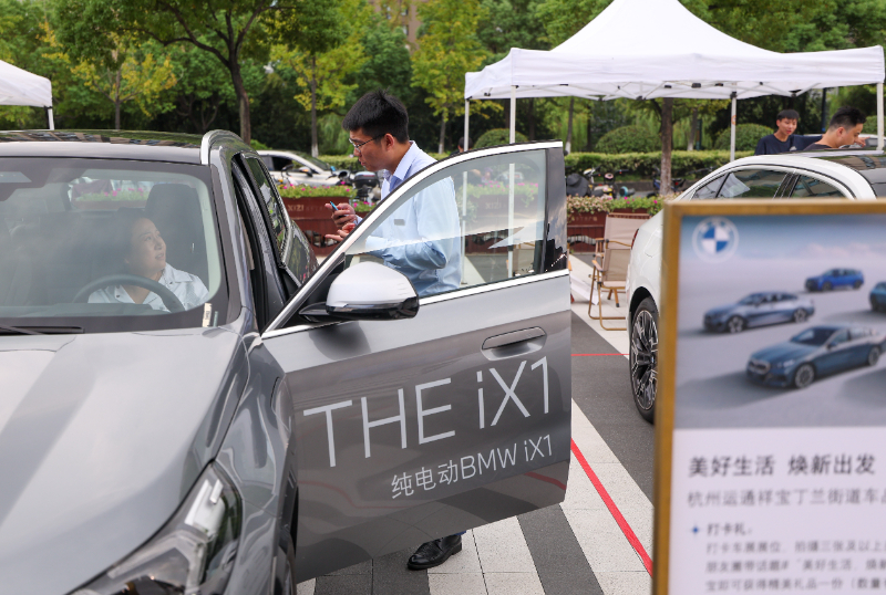 (资料照片)经销商在消费品以旧换新展会现场向消费者介绍车辆。新华社记者 江汉 摄