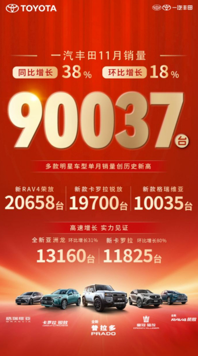 回顾11月,一汽丰田的销量成绩无疑是一份亮眼的成绩单。终端销售达到90037台,环比增长18%,同比增长38%,这一数据创下了历史新高,充分证明了一汽丰田在产品品质、市场定位以及销售策略上的卓越表现。无论是新款格瑞维亚的豪华体验,还是新RAV4荣放的实用性能,都赢得了消费者的广泛好评和高度认可。这些车型不仅在设计上紧跟时代潮流,更在配置和性能上进行了全面升级,满足了消费者日益增长的美好出行需求。