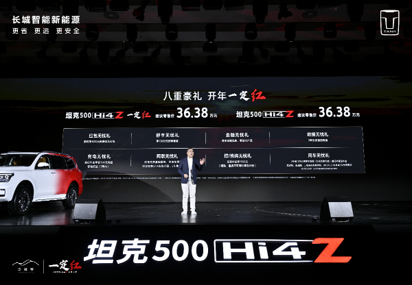 坦克500 Hi4-Z售价36.38万元,坦克500 Hi4-Z“一定红”同步发售。2月28日前下订可享受购车八大权益:4000元新春购车红包、13000元舒享套餐和金融、增换购、网联、充电、用车、救援六大无忧礼。