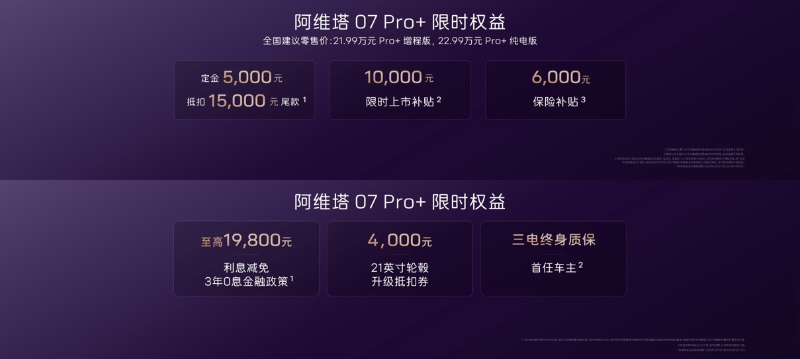 与此同时,针对本次阿维塔07 Pro+的上市,阿维塔还推出了重磅购车礼遇,即日起至2025年3月31日,下定用户可享六大限时权益:支付5,000元定金抵扣15,000元尾款、10,000元限时上市补贴、价值6,000元的保险补贴、至高19,800元的3年0息金融政策、价值4,000元的21英寸轮毂升级抵扣券、首任车主三电终身质保。