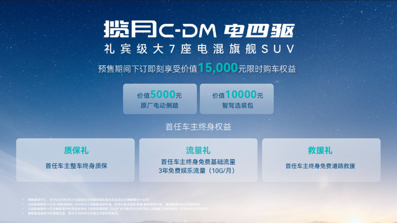 揽月C-DM定位礼宾级大7座电混旗舰SUV,共推出180超长续航Max四驱、180超长续航Ultra四驱两个版本,均配有2+2+2的6座、2+3+2的7座可选。官方预售价格23.99万元-25.99万元。
