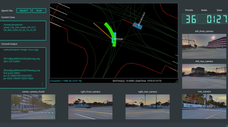 在现场演示中,商汤绝影展示了「开悟」世界模型与主车闭环交互的方式。通过场景库文件导入一个BEV视角下的初始主车和他车位置,世界模型自动生成主车视角下11V(11个摄像头)的传感器仿真数据,端到端模型接收到这一数据后,生成自车下一时刻位置并进行反馈,世界模型根据刷新的主车位置和预测的他车位置渲染新的11V传感器仿真数据。