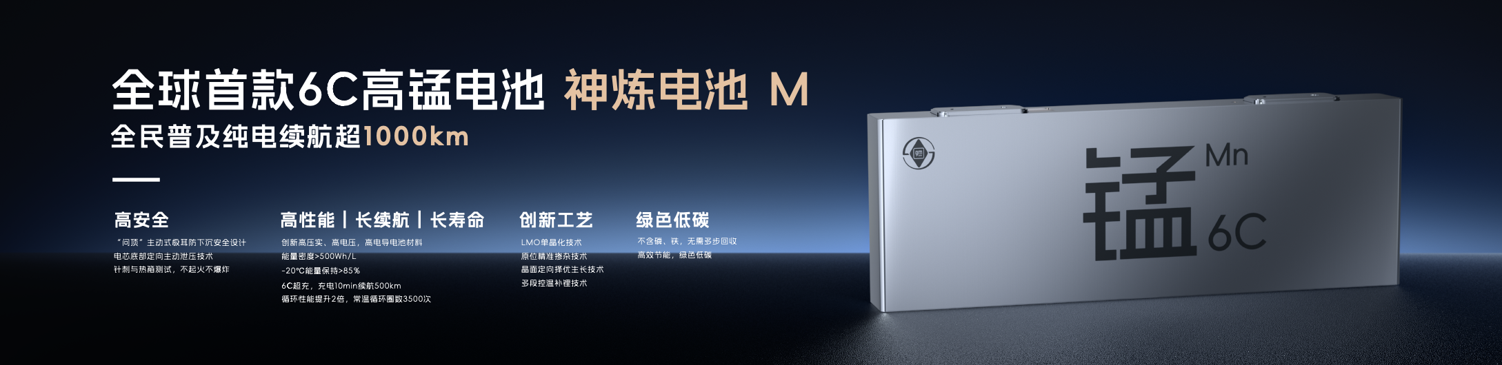 面向未来,神炼电池4.0也进化登场,将采用800V平台、CTB、智能无线BMS和AI能量管理等多项技术,并通过全新智能温控技术、3D多面立体热管理和热电分离技术实现安全再升级。同时,全球首款6C高锰电池——神炼电池M也将全面加持神炼电池4.0,7分钟即可补能50%,结合独创的问顶高安全极耳设计和创新体系复配技术,进一步提升电池在安全、性能、续航和寿命方面的综合表现,全力助推纯电续航超1000公里的全民普及。