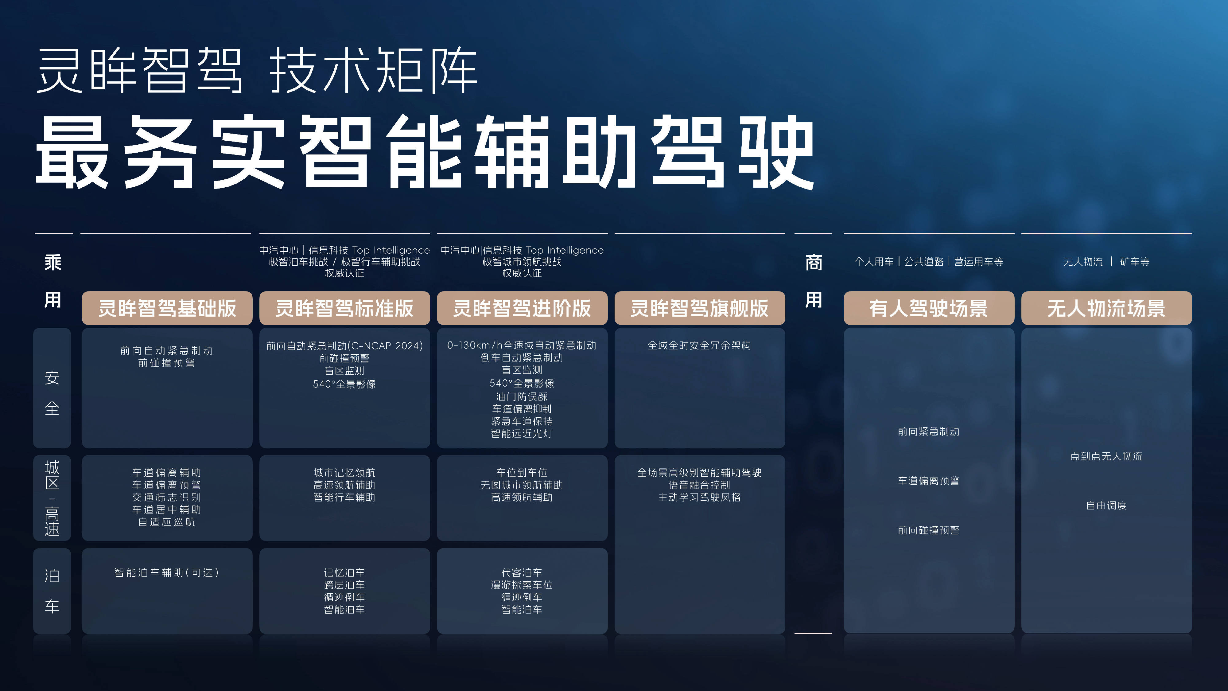 其中,灵眸智驾标准版支持前向AEB、高速NOA、智能泊车等功能,标配城市记忆领航和跨层记忆泊车,为⽤户提供同级别最强辅助驾驶体验。灵眸智驾进阶版则采用能力更高的硬件平台,加入八大主动安全功能,以全速全向AEB、油门防误踩等功能守护用户出行,支持位到位城区领航辅助和代客泊车功能,带来覆盖全程的智驾体验。在此基础上,灵眸智驾旗舰版采用更高标准安全冗余架构和⽣成式世界模型,算力达500TOPS,打通全场景,在实现更高级别智能辅助驾驶的同时,更可融合语音控制、学习驾驶风格,让安全守护的尺度更贴近驾驶者的个人喜好。