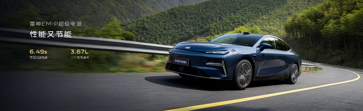 吉利银河星耀8是吉利银河品牌首款搭载雷神超级电混双动力的车型,用户既可以选择节能又性能的雷神EM-P超级电混,也可以选择极致节能、超长续航的雷神EM-i超级电混。搭载雷神EM-i超级电混的吉利银河星耀8,搭载全球最高热效率46.5%的1.5L混动专用发动机与E-DHT 11合1电混专用电驱,两大超级节能硬件助力其成为5米级最低油耗轿车,馈电油耗仅为3.36L(CLTC工况);搭载雷神EM-P超级电混的版型,则拥有6.49s的零百性能表现,百公里馈电油耗仅为3.67L(CLTC工况)。