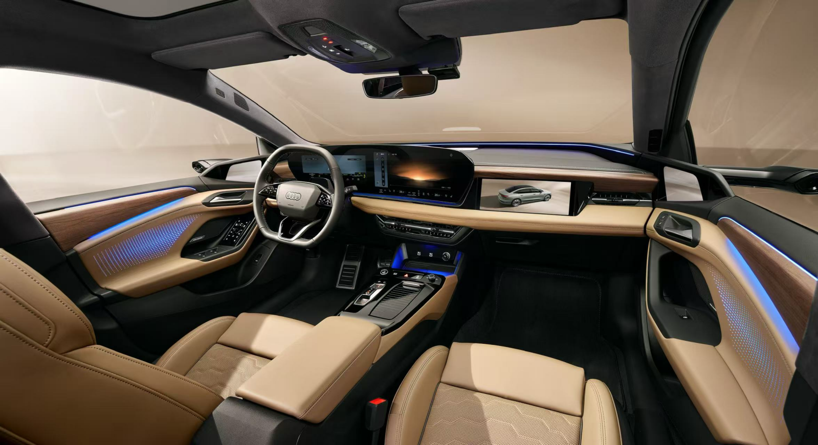 全新纤薄的奥迪MMI全景显示屏,由11.9英寸奥迪虚拟座舱显示屏以及14.5英寸曲面OLED屏组成,与10.9英寸主动隐私副驾屏,共同打造出“以人为中心”的数字舞台;同级唯一交互式内饰氛围灯和最大面积W-HUD,进一步提升科技感;全系标配的“云感座椅”根据中国消费者体型特征量身定制,以深度融合的人机工程学设计,从靠背到大腿区域17个不同位置,重构乘坐体验;车内配备了9段式天幕,三重镀银技术实现99.9%紫外线、99.5%红外线以及88%能量隔绝;更有同级唯-原厂星空顶。天幕上共有 102颗 RGB·LED,可实现无极调色,与其它内饰氛围灯交互联动,可在迎宾、能量、律动、小憩四种模式中,呈现星空顶等不同流水动画。此外,集成20枚扬声器的B&O高端音响,具备车辆噪声补偿(VNC)功能,为人们带来沉浸式听觉享受。