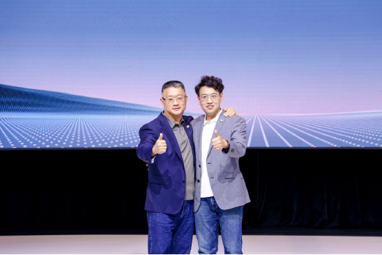 上汽集团总裁贾健旭(左)与火山引擎汽车总经理杨立伟(右)合影