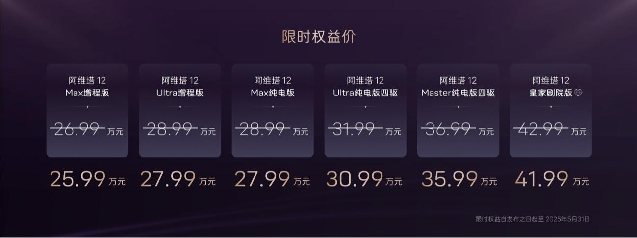 5月7日,阿维塔科技宣布,阿维塔12 2025款焕新升舱,推出纯电和增程双动力,共6个车型版本,官方指导价为26.99-42.99万元,权益与功能配置全维升级,权益后到手价为25.99万元-41.99万元(限时权益自发布之日起至2025年5月31日),新增岱红内饰配色、2款21寸运动轮毂供消费者选择。其中,Ultra纯电版四驱到手价30.99万元,即可享受华为三激光雷达、英国之宝25扬声器、21英寸光束多辐运动轮毂、CDC动态阻尼减振器等多重百万级豪华配置。