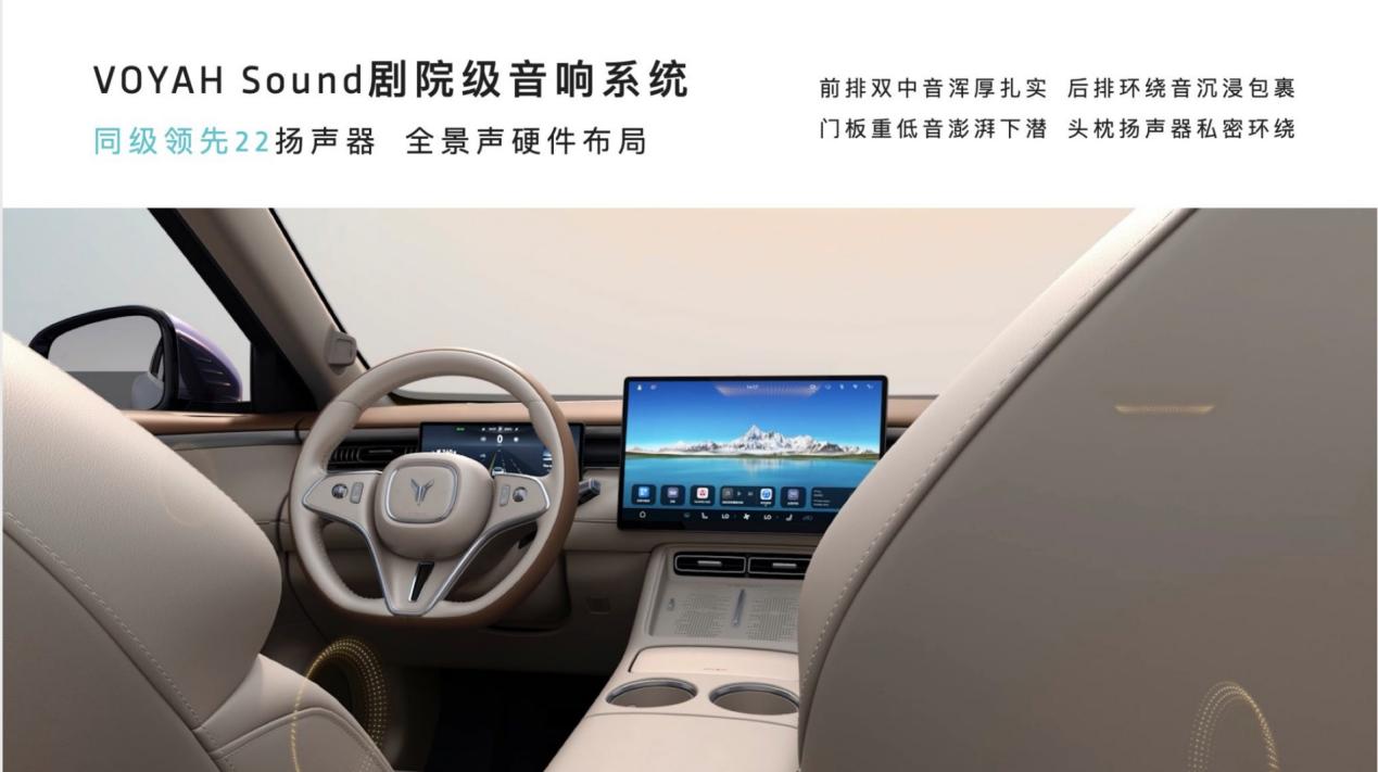 VoyahSound剧院级音响搭载了22个经过精密声学布局的扬声器,更是在传统杜比7.1.4环绕声基础上创新加入主副驾头枕音响,打造出了更沉浸的视听体验,不仅能带来单人驾驶时的深度沉浸,也能在双人出行时实现共享天籁或互不打扰的个性化出行体验;独有的岚擎模式更可带来超跑级的引擎声浪与换挡震动,享受媲美赛道竞速的激情澎湃。
