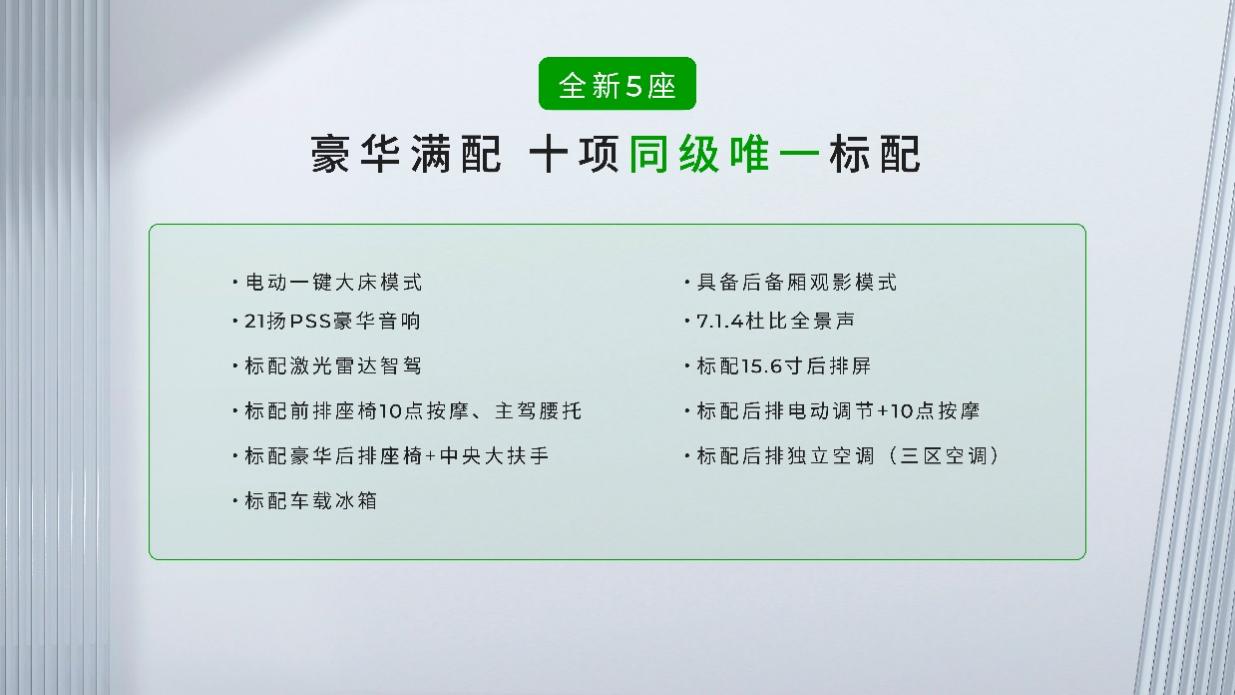 唯一标配电动一键大床模式:后排座椅支持一键电动下沉前移,放倒后可形成2米纯平大床,瞬间化身“移动卧室”;唯一配备后备厢观影模式:户外露营后排成床时,可利用床垫、撑杆,并搭配15.6英寸后排屏与21扬声器PSS豪华音响组合,打造沉浸式家庭影院;唯一搭载1663L超大百变后备箱:通过后排座椅放倒及多层储物格等设计,可拓展出无限想象的空间,可同时放置多辆公路自行车,露营、骑行、钓鱼、滑雪、冲浪等户外场景装备统统装得下。