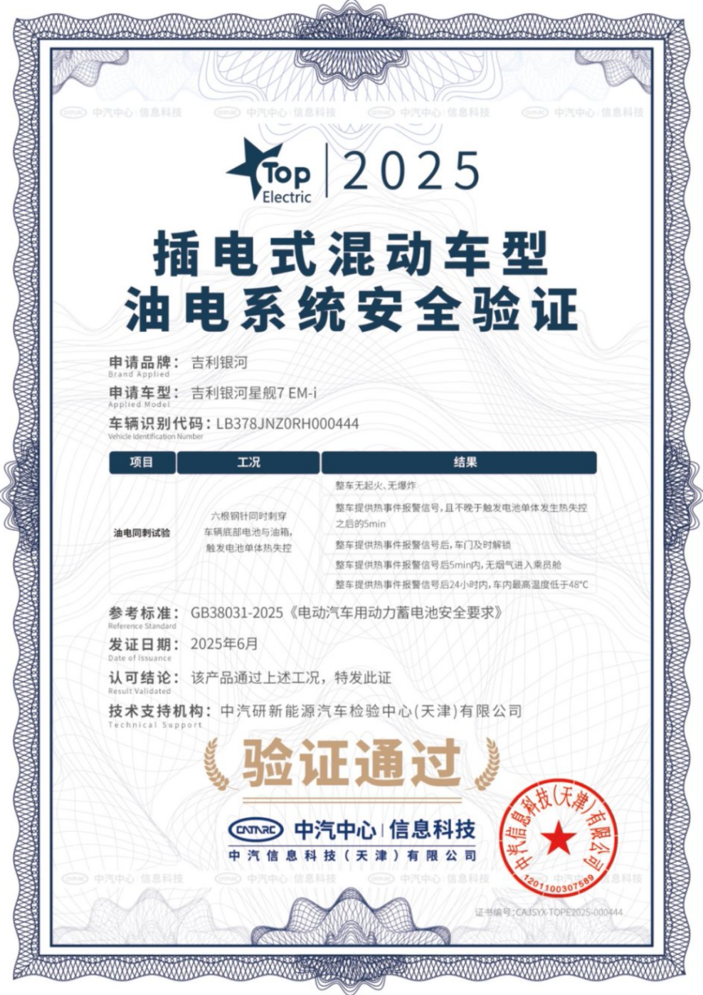 6月24日,吉利银河星舰7EM-i作为001号测试车辆,在中汽中心新能源检验中心,顺利通过行业首次动力电池、油箱同步穿刺试验,并获颁中汽中心行业首个插电式混动车型油电系统安全验证,进一步验证搭载吉利神盾电池安全系统的吉利银河星舰7EM-i超标准的安全冗余,树立A级插混SUV安全新标杆。