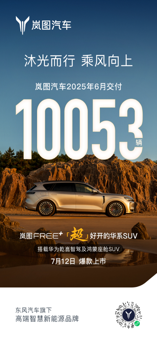 7月1日,岚图汽车公布上月销量数据。6月,岚图汽车单月销量达10053辆,同比增长83%。1-6月,岚图汽车累计销量达56128辆,同比增长85%。在高端新能源MPV领域,爆款岚图梦想家站稳冠军。岚图另一款“听劝”的爆款产品,岚图FREE+也在火热预售中。从强势发展势头来看,岚图“智慧 品位 信赖”的品牌形象已经赢得新时代中坚力量认可,正在全面巩固夯实央国企高端新能源第一品牌地位。