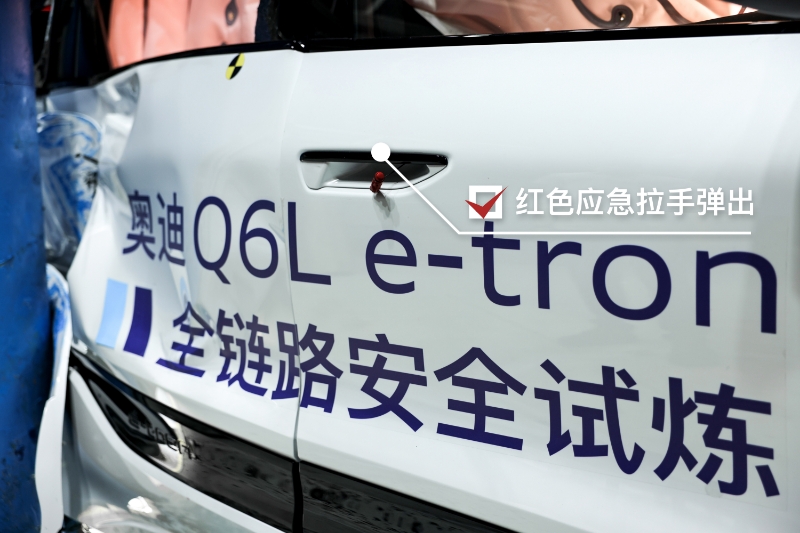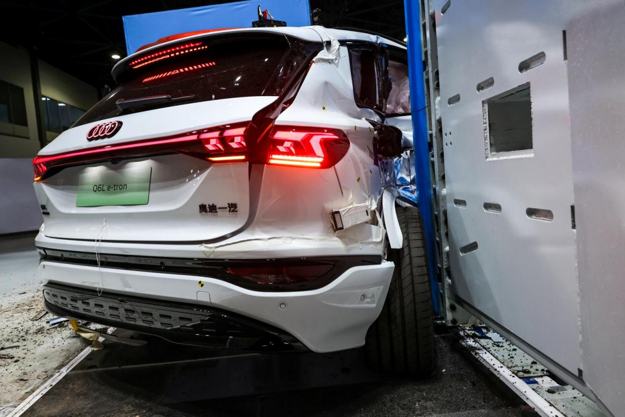 碰撞后一汽奥迪Q6L e-tron车身结构完整,A、B、C、D柱均未发生结构性失效