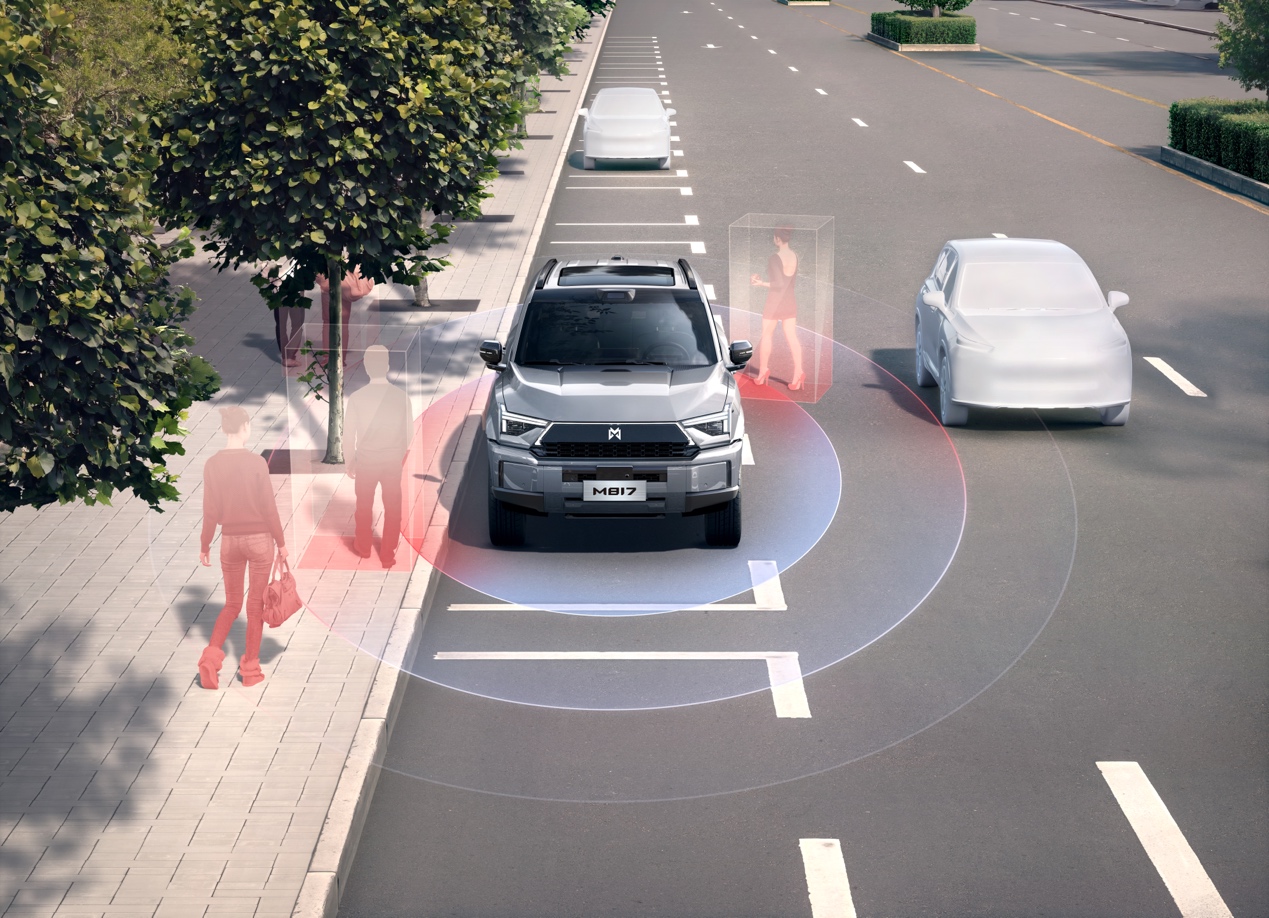 猛士M817的全维防碰撞系统CAS4.0系统,实现4-150km/h行车状态下刹停避障、130km/h可刹停静止障碍物的全时速守护;前向+后向+侧向23项主动安全功能的360°全方向守护;具备任何种类任何状态的目标识别检出能力的全目标守护;首创路面自适应AEB,湿滑泥泞路面也能刹停的全天候守护;具备人驾和辅助驾驶时都能保障主动安全的全场景守护,让用户出行更安心、更放心、更省心。