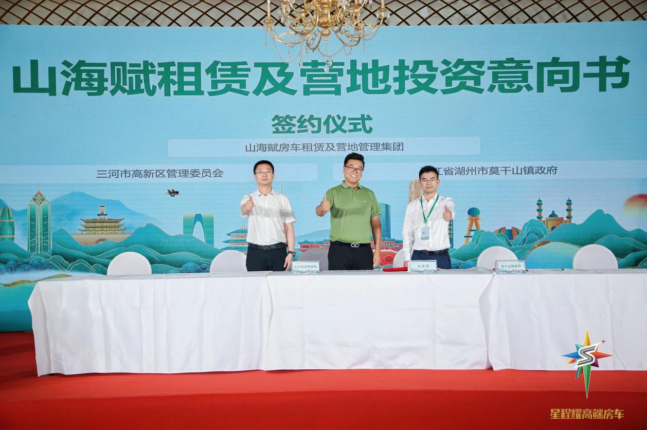 而由山海赋牵头,与莫干山高新区、三河经济开发区签订的“山海赋租赁及营地投资意向书”由山海赋集团董事长周子程、莫干山高新区党工委委员管委会副主任李智、河北三河经济开发区综合管理局局长张雨生共同签订,签约总金额高达3.2亿元,旨在打造租赁及营地运营中心,并围绕当地景观打造超过100亩特色营地,并联动景区资源为当地提供超过100个服务就业岗位。