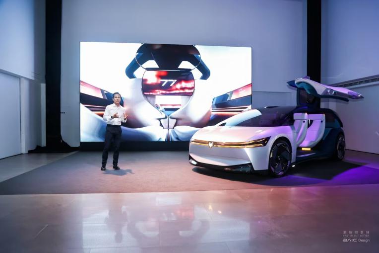 在沙龙现场,北汽集团全球设计VP、首席设计官罗伟基携加入后的首款作品——极狐 ARCFOX 77° 概念车亮相。罗伟基表示,未来汽车市场的竞争,是“设计力”的竞争,我们将通过设计实现差异化。