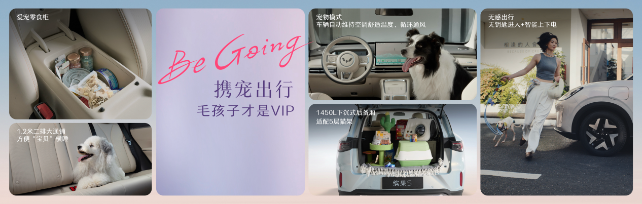 用户携宠出行时,缤果S标配的无感进入功能让用户在抱着宠物的情况下也能够轻松上下车;宠物模式实现车辆自动维持空调舒适温度、循环通风,用户离车时宠物在车里依旧安全惬意。车内空间宽适,二排1.2米大通铺让爱宠肆意横躺;多处储物空间,方便宠物用品及零食分类收纳、随用随取;1450L超大后备厢更可轻松容纳五层猫爬架,多宠家庭出行亦从容有序。
