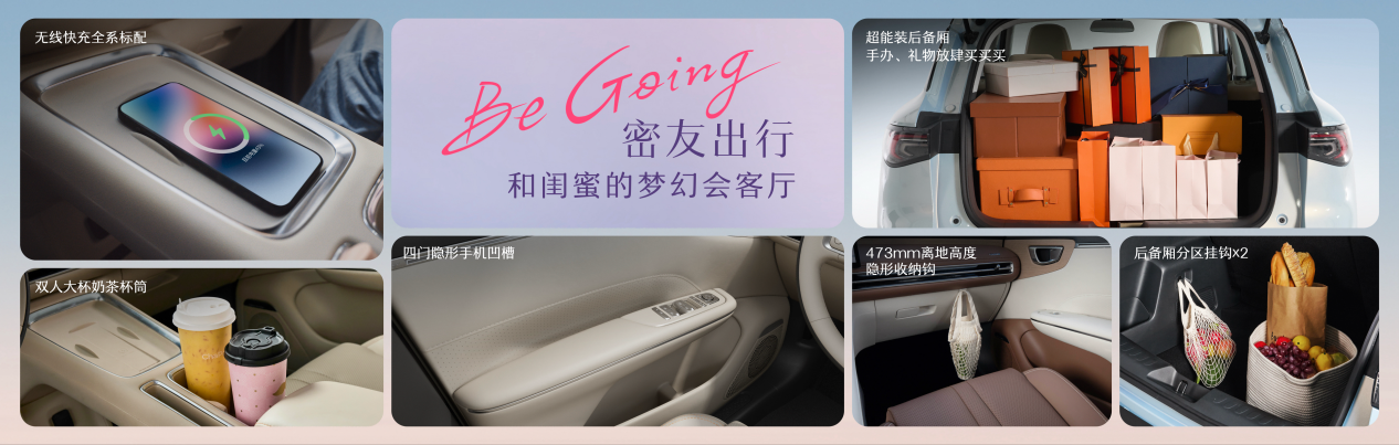 密友出行场景下,缤果S提供50W无线手机快充功能,告别手机电量焦虑;前排配备双人奶茶杯筒,深浅搭配奶茶杯“不打架”,人手一杯;隐藏式挂钩稳稳挂住各种外卖袋,无需担心开车晃洒,更有后备厢分区挂钩,分区悬挂不串味;门板隐形手机凹槽触手可及,主流大屏手机稳稳收纳,美美聚会随心欢乐。