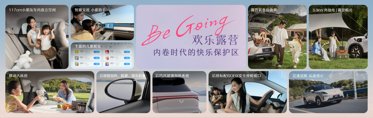 对于喜爱露营的用户,缤果S提供3.3kW外放电功能,开启露营模式后锁车不下电,走动不误触。1450L下沉式后备厢适配0-10岁童车,轻松收纳所有装备;后排放平后即可形成移动大床房,休憩更自在;车机自带丰富儿童娱乐应用,儿歌、动画片应有尽有,更有能说会道的小菱助手,陪小朋友聊天、讲故事,让旅途充满欢声笑语。同时,用户可开启定速巡航功能,远途更省心;后视镜及后挡风玻璃均配备加热功能,保证雨雪天气行车安全;锁车后后视镜自动折叠,有效防止左右剐蹭。