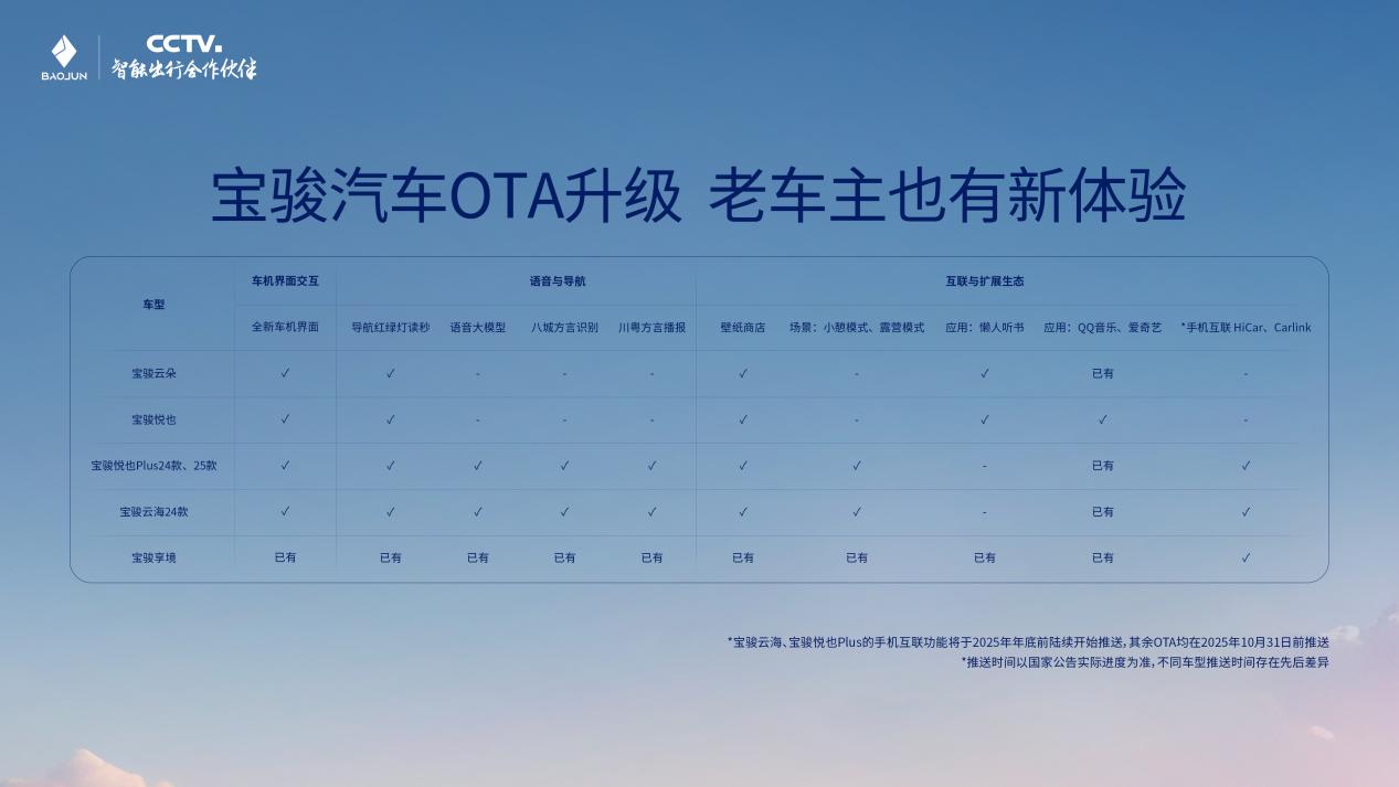 2025年10月31日前,宝骏汽车五款车型将陆续OTA最新灵语座舱体验。宝骏云海2024款、宝骏悦也、宝骏悦也Plus2024款及2025款、宝骏云朵,将迎来全新的车机界面交互、导航、壁纸等网联功能,界面更美观,体验更个性。此外,宝骏享境将新增HiCar、Carlink手机互联,让互联无界。宝骏云海、宝骏悦也Plus也将在今年年底升级全新手机互联,畅享丝滑手机互联体验。