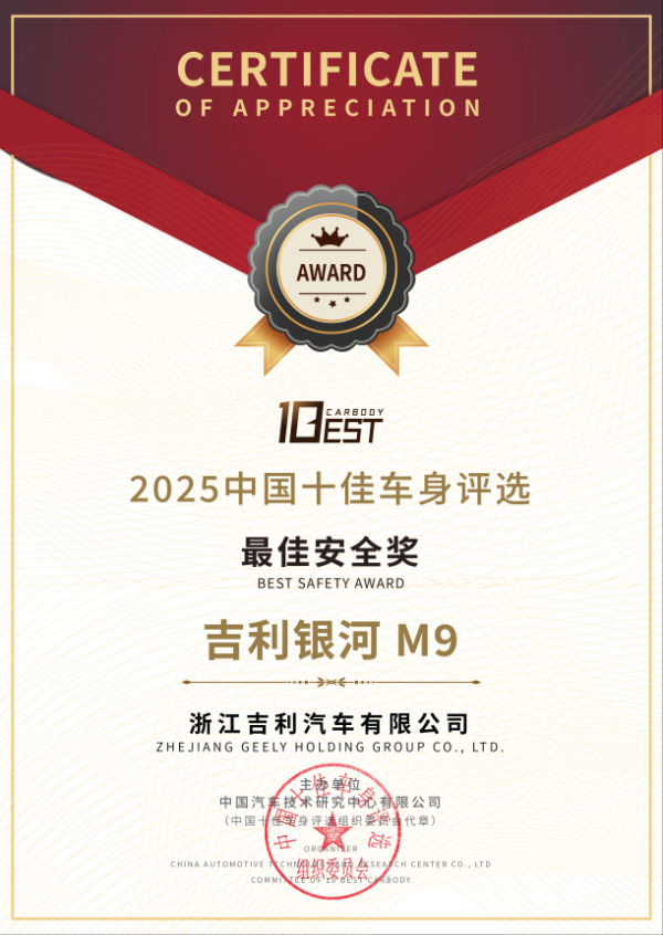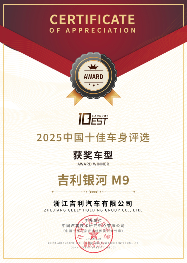 近日,在中国汽车技术研究中心有限公司主办的“2025中国十佳底盘”及“2025中国十佳车身”评选中,吉利银河M9凭借静态、动态两大维度的出色表现,荣膺年度“十佳底盘”、“十佳车身”,“最佳安全”,GEAEvo架构获“最佳架构”单项大奖。