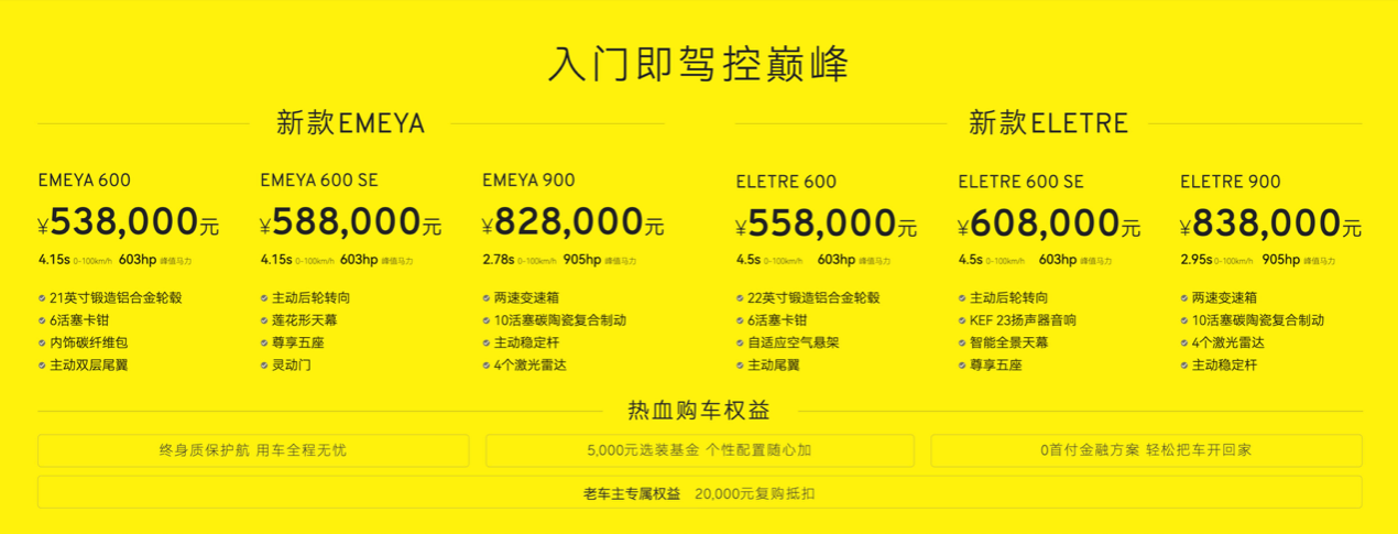 9月21日,莲花新款EMEYA与ELETRE正式上市。新款莲花EMEYA全国统一零售价为53.8万元起,新款莲花ELETRE全国统一零售价为55.8万元起,选购新款莲花EMEYA/ELETRE可享受终身质保、5000元选装基金、0首付金融方案等多重购车权益。