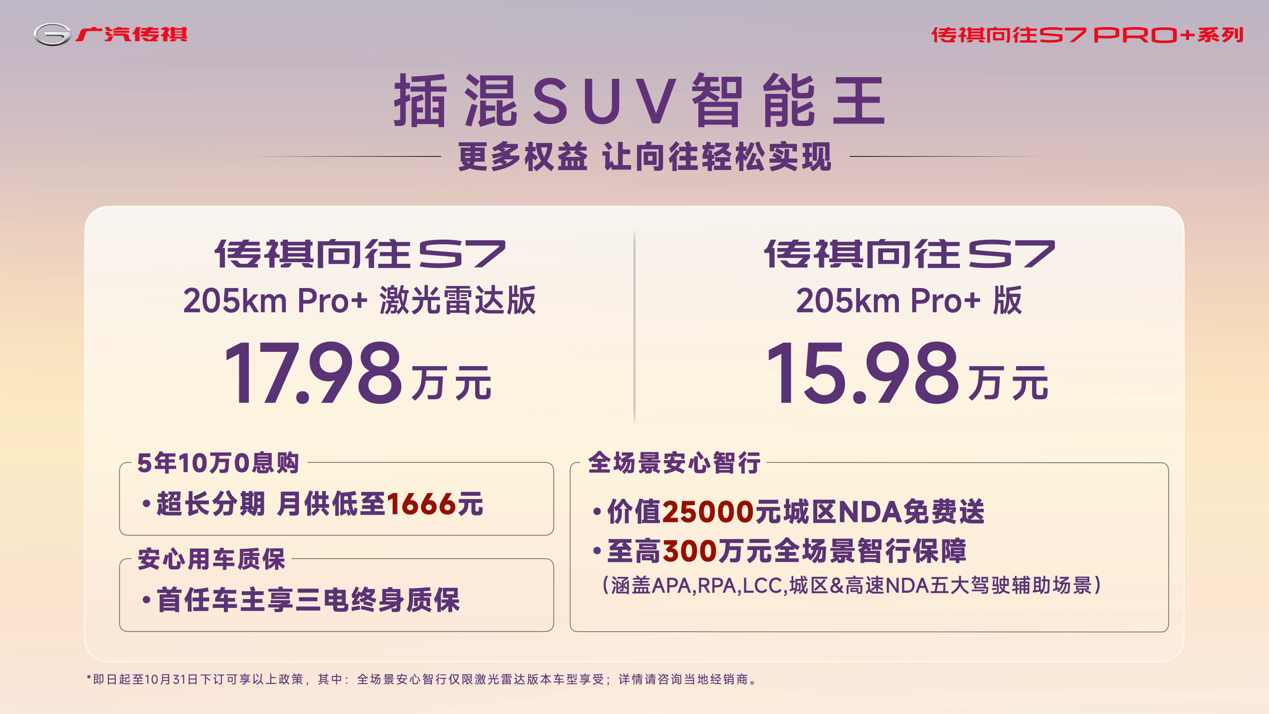 同时,作为向往系列第一车,传祺向往S7全新Pro+系列售价15.98万元起,更带来传祺史上最给力的金融政策:5年10万0息,月供低至1666元,还有价值25000元城区NDA免费送、至高300万元全场景智行保障,首任车主还可享三电终身质保。