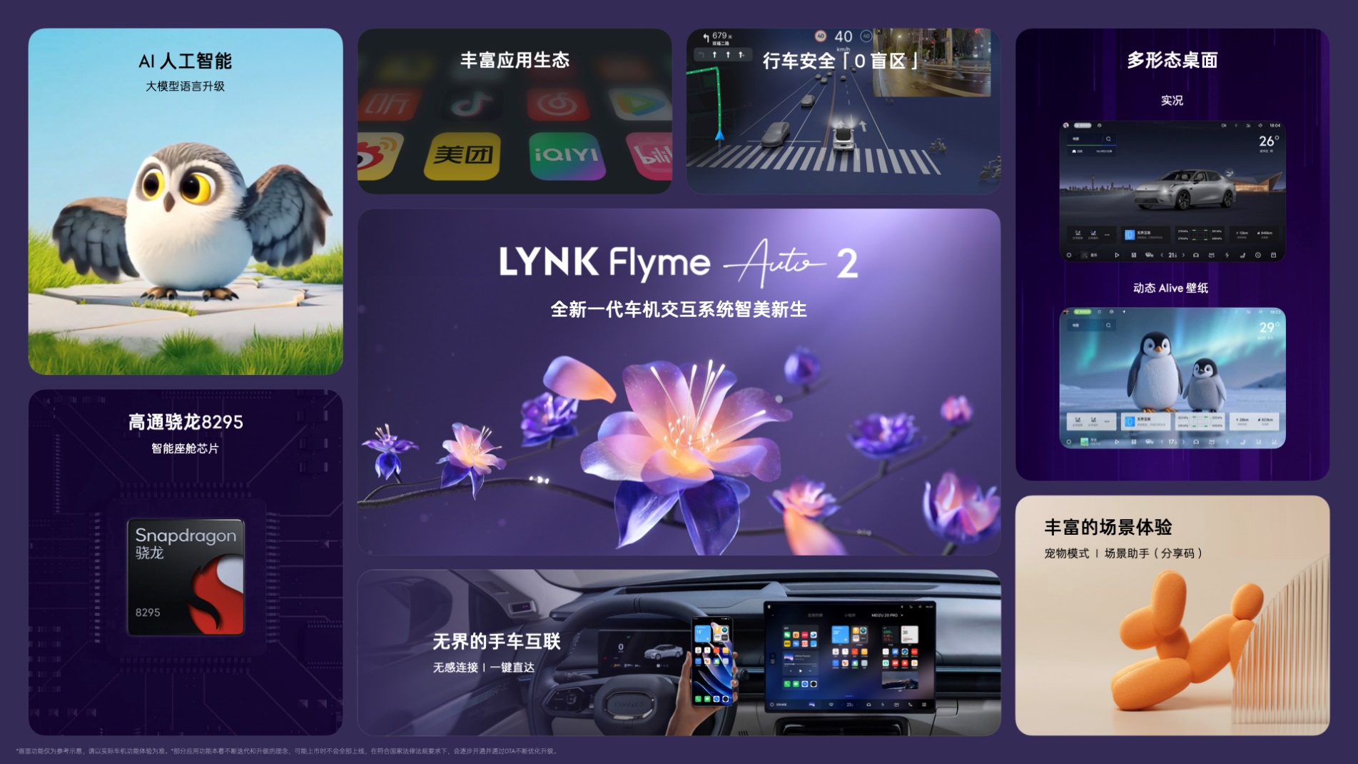 LYNKFlymeAuto2致力于打造全手机生态友好的车机系统,支持ICCOA1.6(小米/oppo/Vivo)、HiCar、CarPlay(后续OTA)等多款手机生态互联,手机视频、导航路线无缝流转到车载大屏,带来更丰富的手车互联体验。同时,LYNKFlymeAuto2还支持PS5、Switch等外设有线接入,在停车休憩时享受沉浸游戏体验,将座舱变为随行娱乐空间。