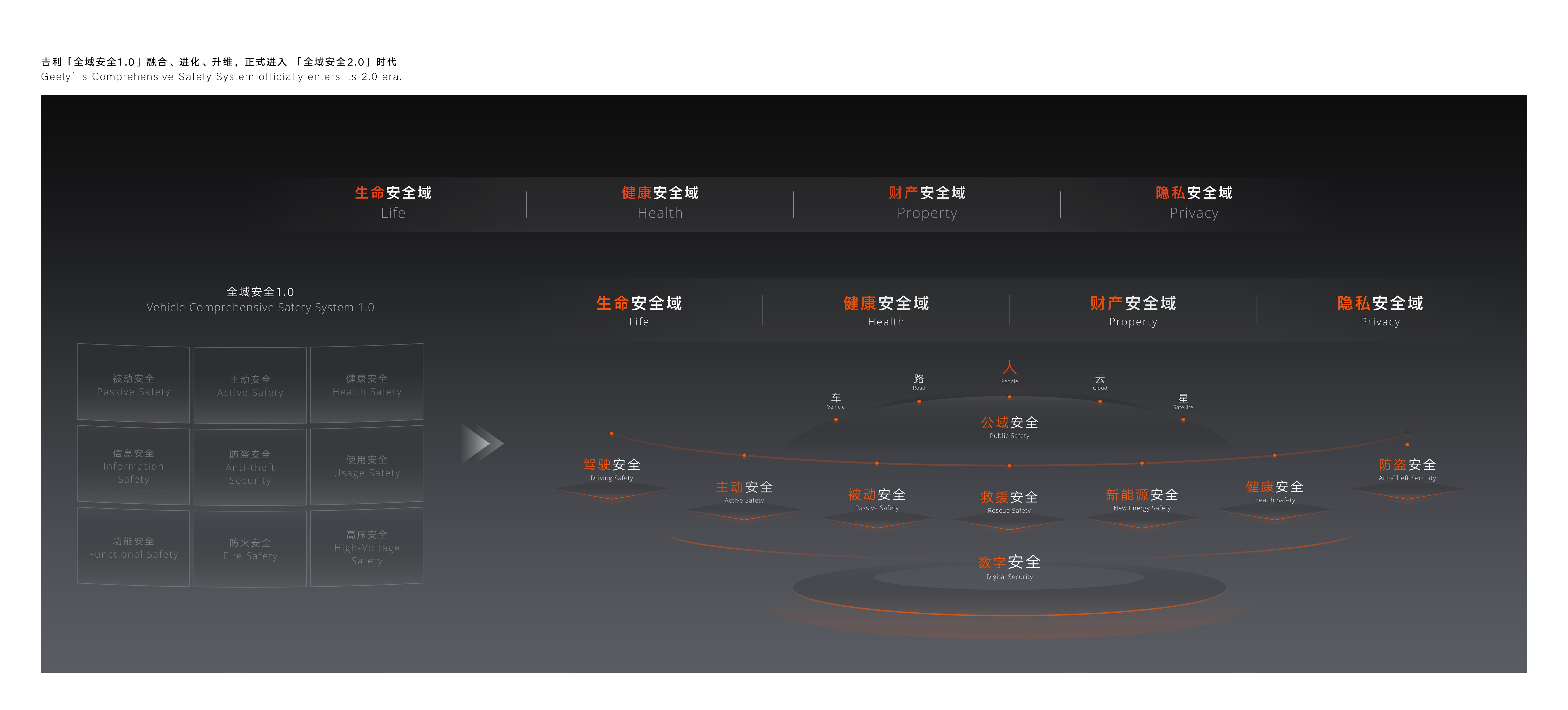 作为行业安全技术的先行者与引领者,吉利在“全域AI”技术体系的赋能下,以“AI为纲责任为本”,基于原有的“全域安全”技术体系进阶打造“全域安全2.0”技术体系。结合智能时代的安全新需求和新挑战,“全域安全2.0”技术体系秉持“以人为尊”理念,通过技术升级、能力突破与范式创新,将侧重“整车安全”的视角升级为“人-车-路-云-星”的生态视角,旨在贯穿用户出行全场景、覆盖出行全领域、联动出行全生态;并以“生命零伤亡、健康零危害、财产零损失、隐私零泄露”四大安全愿景为指引,逐步构建的一套为消费者提供全面的安全保障技术体系。