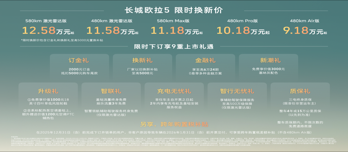 12月16日,长城汽车欧拉品牌全新A级纯电SUV——长城欧拉5正式上市。新车共推出5款配置,建议零售价区间为9.98万至13.38万元,限时换新价9.18万元起(限时换新价包含“订金礼”和“换新礼”至高5000元以旧换新补贴)。为回馈广大用户的热爱与支持,即日起至2025年12月31日,用户下订并锁单即可尊享包含订金礼、换新礼、智行无忧礼在内的9重上市好礼,以及跨年购置税补贴(不含480kmAir版)等丰厚购车权益。