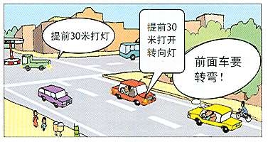 | 在单向 2 车道的道路上,没有专用的左或右拐的车道时,为了让后面的车顺序变更车道,应提前打亮转向灯。至少在踩刹车踏板前打亮转向灯,让后面的车尽早知道你的意图,否则没有思想准备的后方司机会非常被动。 |