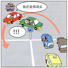 | [ 哎呀,错过拐弯的地方了 !][ 拐弯的地方开过去了 !] 那就先往前开找地方掉头。可是,已经驶入左拐或右拐专用车道,却硬要走直线,或者硬要从直线道进入左或右拐车道,甚至还有些车根本不换车道,让后面的车干等。如果硬加塞给其他的车带来麻烦、造成事故的话,还不如绕点远路,没有什么大不了的。 |